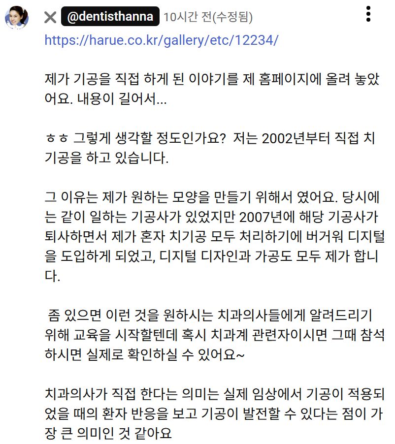 하지만 그때 그 원장님을 보고 나도 그렇게 해야지? 하는 생각은 없었어요. 왜냐하면 치기공이 엄청 시간과 노력을 많이 기울여야 하기 때문에 힘든 작업인 걸 아니까요.