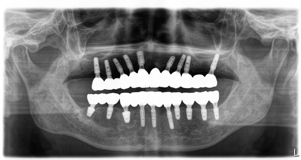 치료는 환자분의 우측 아래 어금니를 발치하는 것으로 시작되었습니다. 이 부위는 뼈 상태가 양호하여 발치와 동시에 임플란트를 심을 수 있었습니다. 이후, 뼈 상태가 좋지 않아 즉시 식립이 어려웠던 윗니 부위는 약 6개월간 뼈가 회복될 때까지 기다렸다가 시술을 진행했습니다. 이처럼 필요한 부위를 순차적으로 치료하고 기다리는 과정을 반복하여, 3년이라는 기간에 걸쳐 모든 치료를 성공적으로 마무리했습니다. 최종 보철물은 여러 개의 임플란트를 연결하는 나사 구조를 적용하여 안정성을 극대화했고, 맞춤형 티타늄 지대주를 이용한 지르코니아 보철로 기능과 심미성 모두를 완벽하게 재건했습니다.