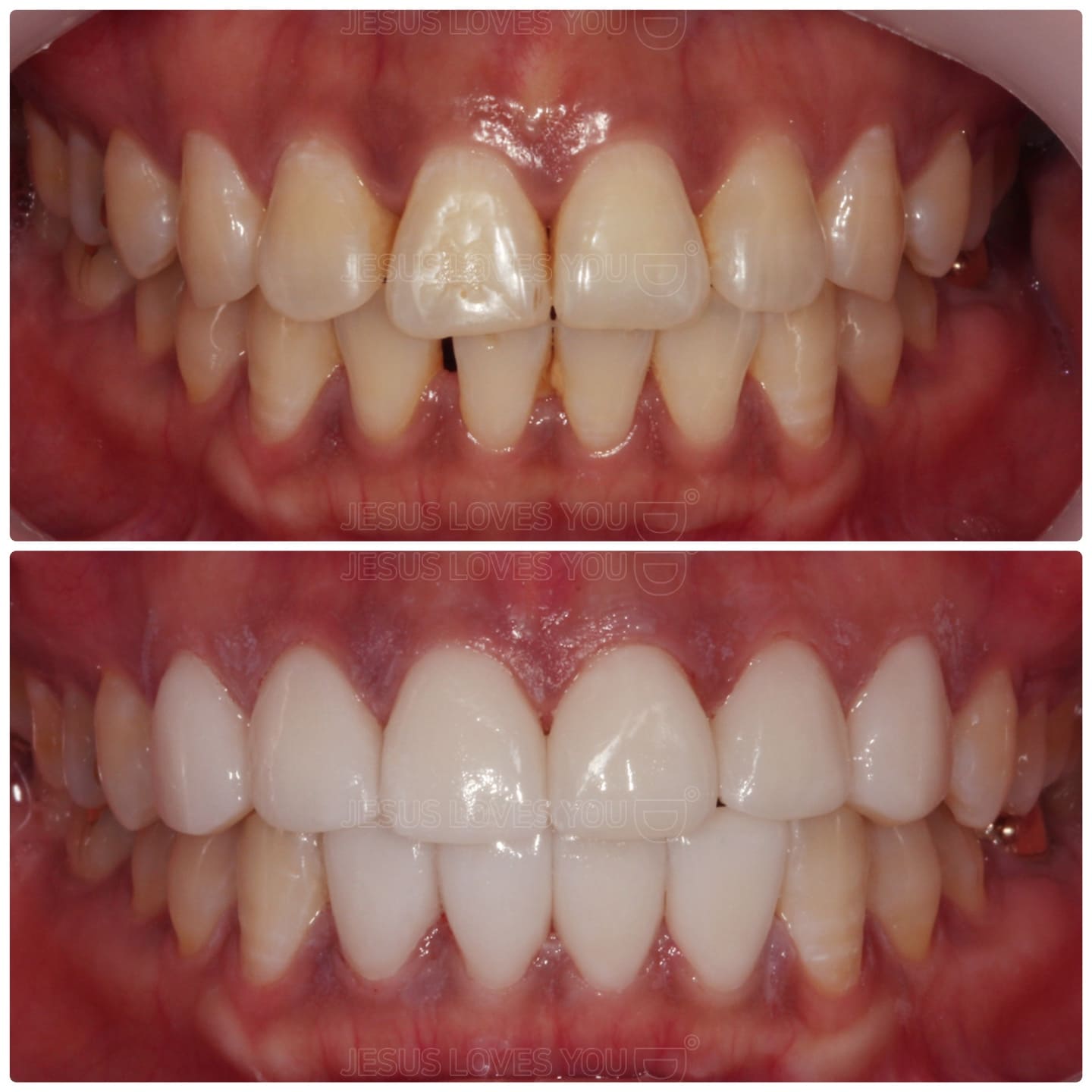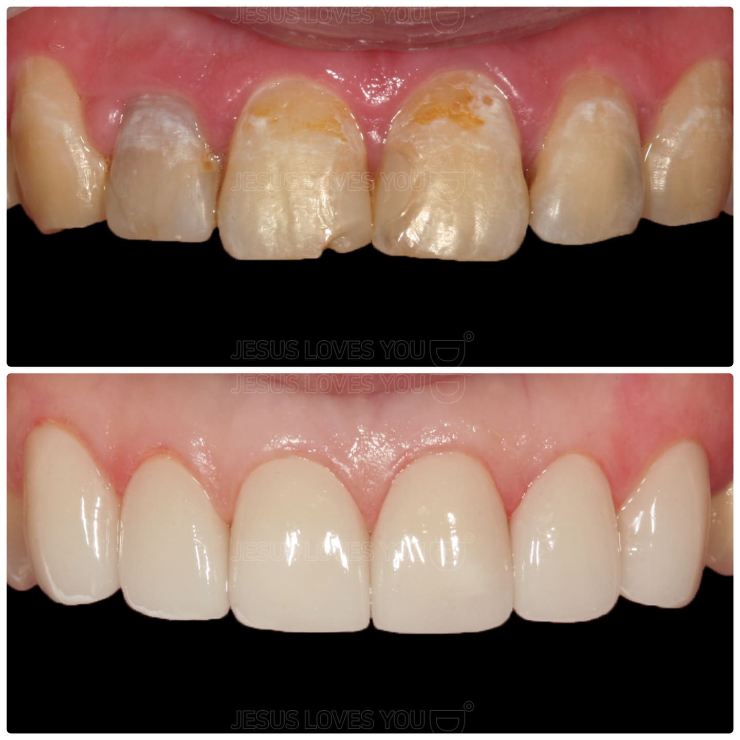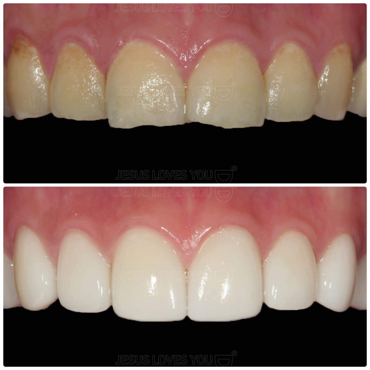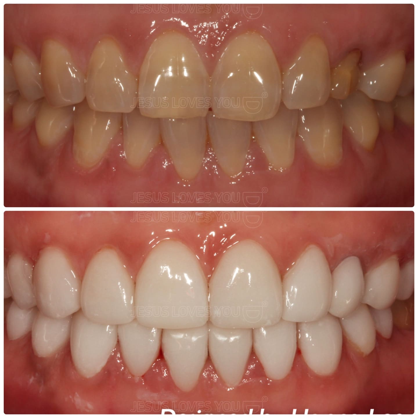 누런 치아 갈색 얼룩과 깨진 앞니, 라미네이트 치료 전후 비교