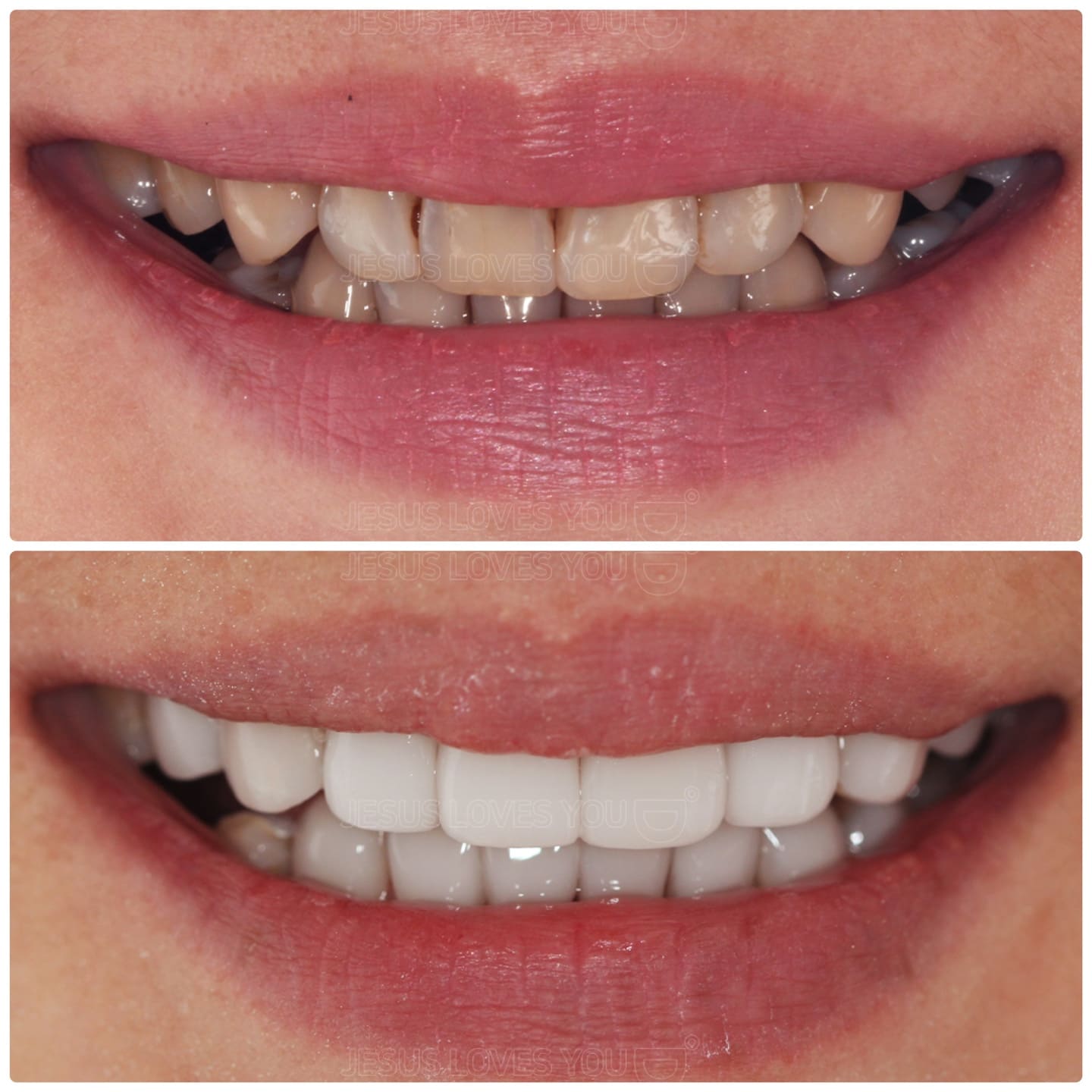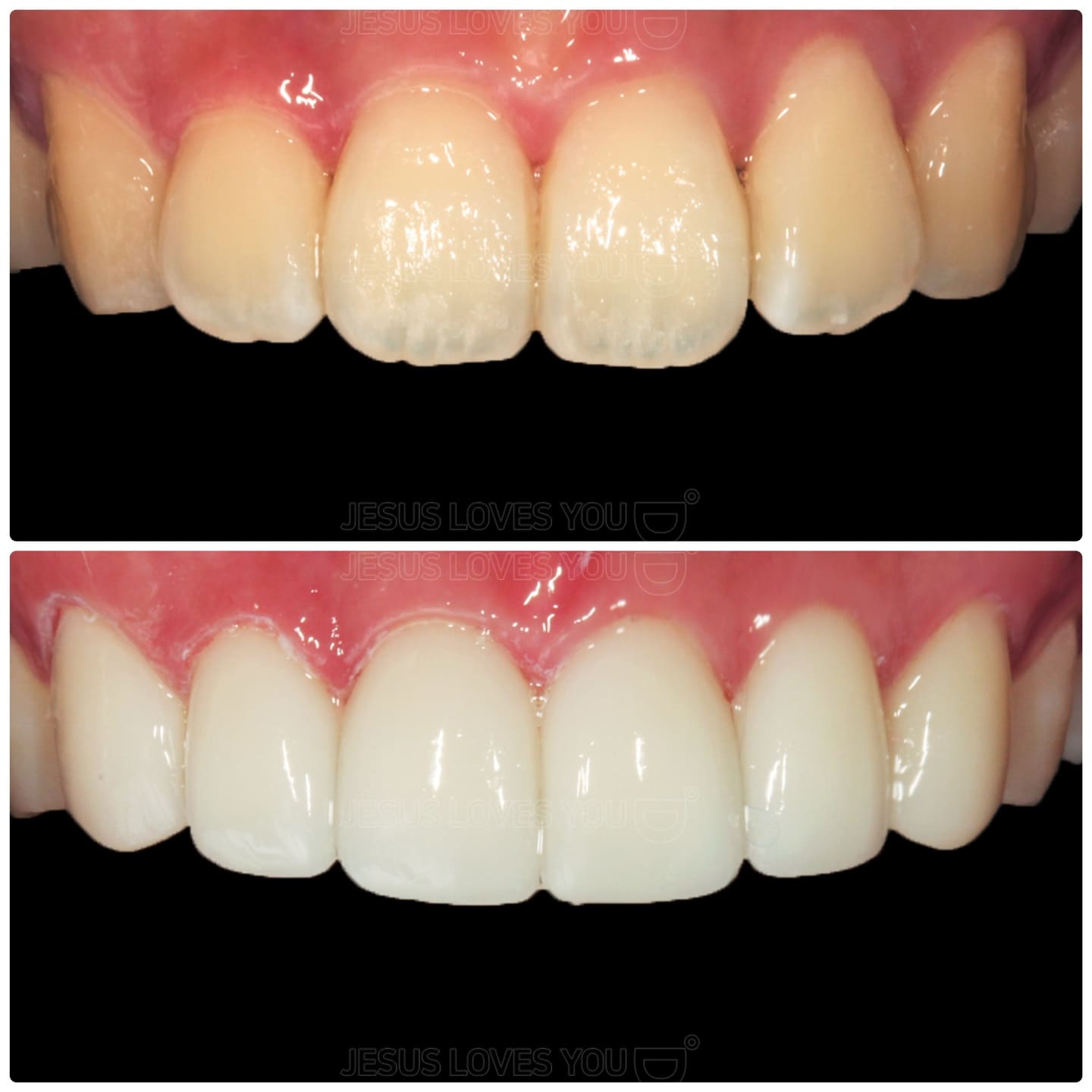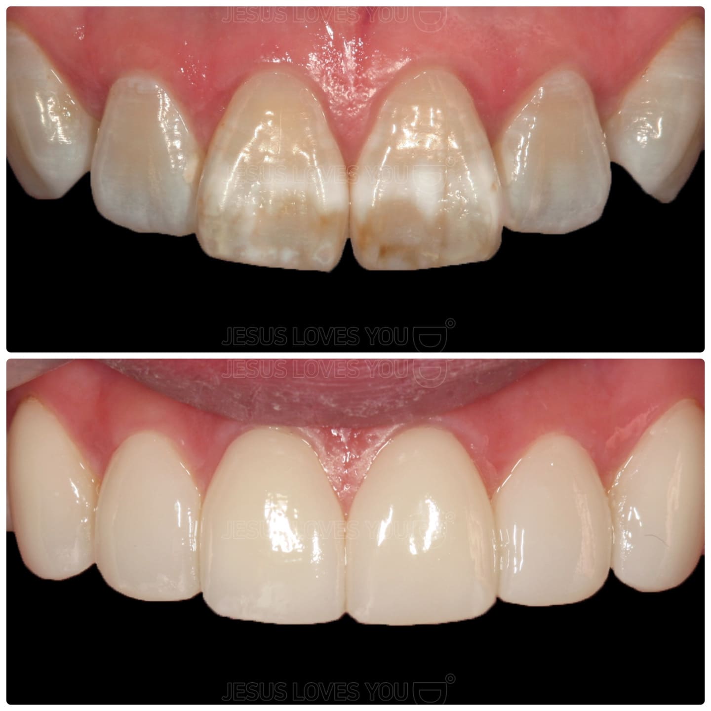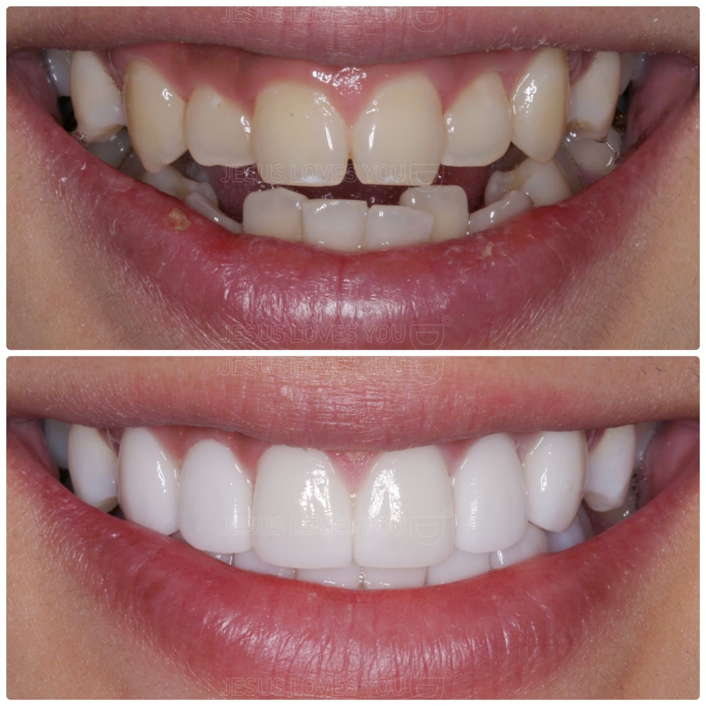 누런 치아 갈색 얼룩과 깨진 앞니, 라미네이트 치료 전후 비교