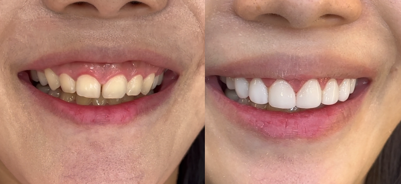 교정후 옥니, 거미스마일(잇몸이 많이 보이는 미소), 누런앞니, 벌어진 앞니 등을 해소하기 위해 무삭제 라미네이트 치료와 잇몸성형으로 치료한 치료사례입니다. 치료는 하루만에 약 3시간 정도가 소요되었으며, 치료후 모습은 치료후 3일 경과에 촬영한 사진입니다.