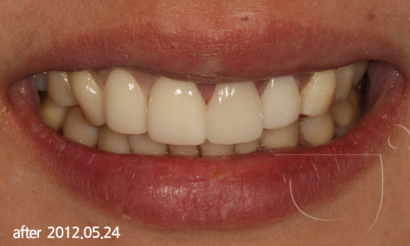 이왕 치료할 때 앞니를 미용적으로 개선하면서 임플란트도 같이 하고자 해서 주변의 치아도 함께 치료한 결과입니다.