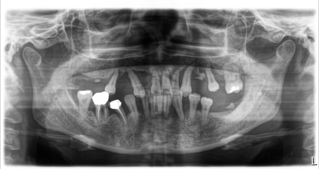 보이는 파노라마 사진의 치아들의 뿌리들은 대부분 턱뼈 속에 거의 조금만 위치하고 대부분은 뼈가 다 녹아있는 것이 보입니다. 그렇게 되면 치아들이 많이 흔들리게 되고 그러면서 치아가 자기 자리를 유지하지 못하고 솟고, 쓰러지고, 벌어지게 됩니다.