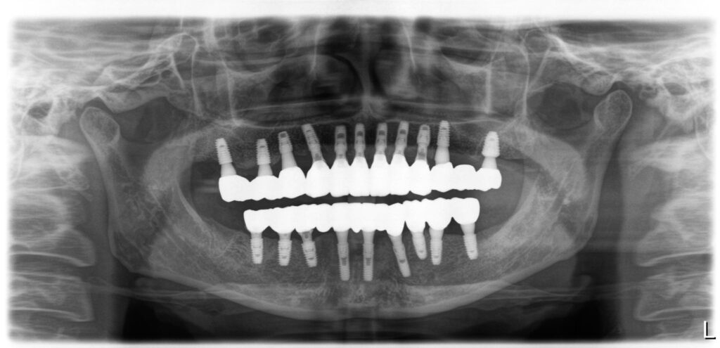 치료후 파노라마 사진입니다. 식립가능한 치아자리에는 임플란트를 식립했고, 브릿지 타입으로 치아와 유사한 모양으로 보철을 완성했습니다. 맞춤지대주에 지르코니아를 이용해서 보철을 했으며, 중요하게 보아야 하는 부분은 치아와 치아사이에 구멍이 있어서 치간치솔 사용이 가능하게 디자인되었다는 점입니다.