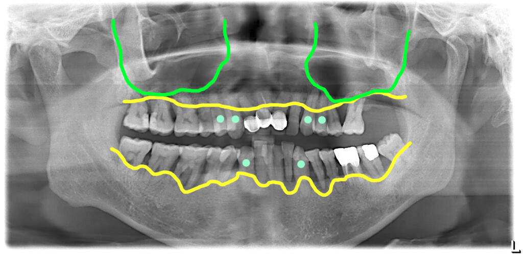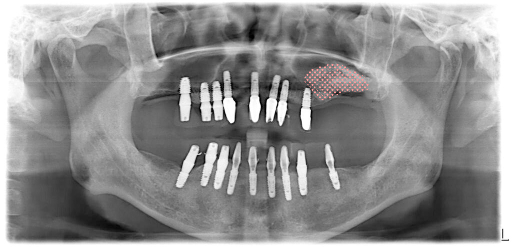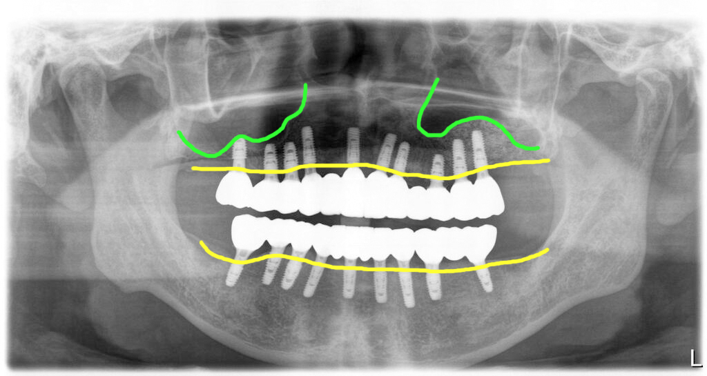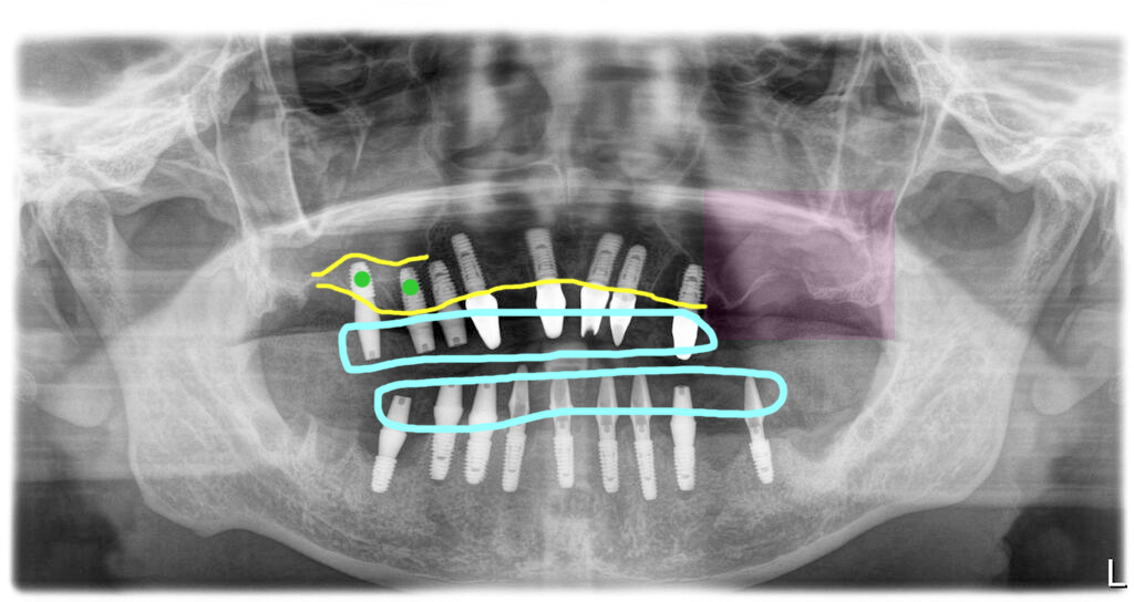 전체 치아를 모두 발치하고 임플란트를 식립했습니다. 우측 위쪽의 상악동부위에는 간단한 방식으로 거상술을 진행했습니다.(초록색)