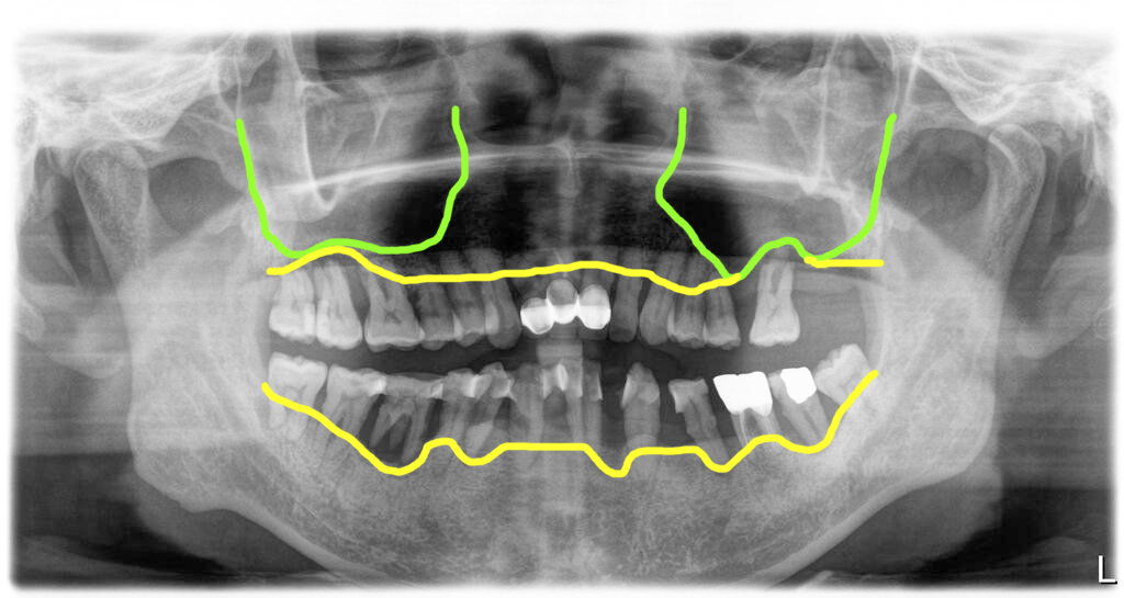 파노라마 엑스레이 상에서 위쪽 어금니부위에 치조골 부분이 없고 바로 상악동이 있는 경우 상악동뼈이식이 필요합니다.