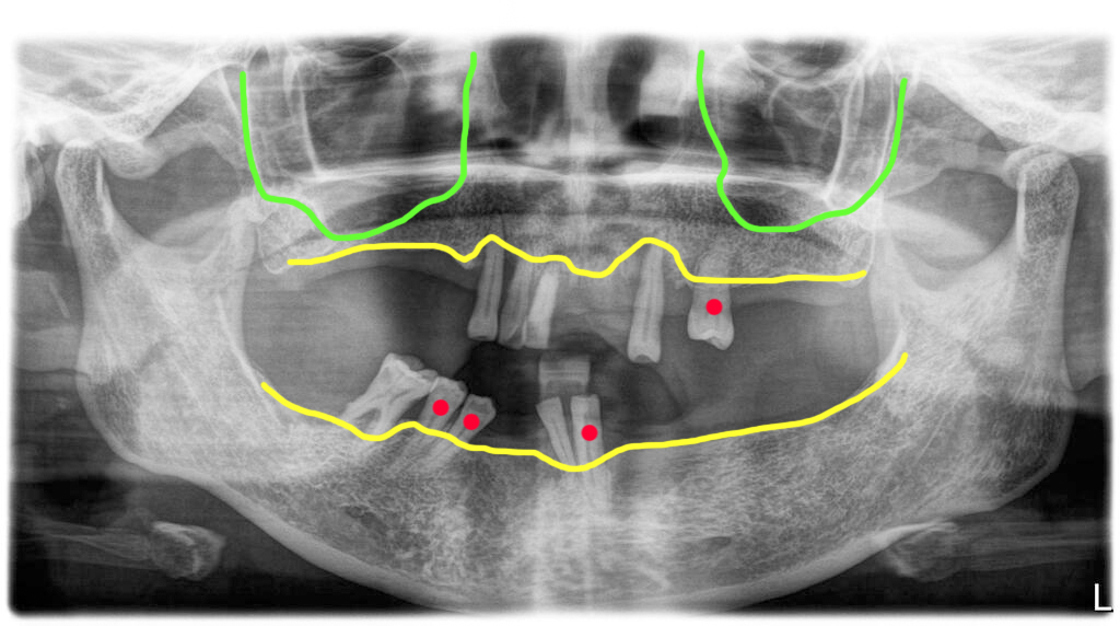 전체적으로 임플란트 치료를 해야 하는 경우에 한 두개의 괜찮은 치아가 있을 때에는 치아의 위치와 잇몸뼈의 상태를 체크해야 합니다.