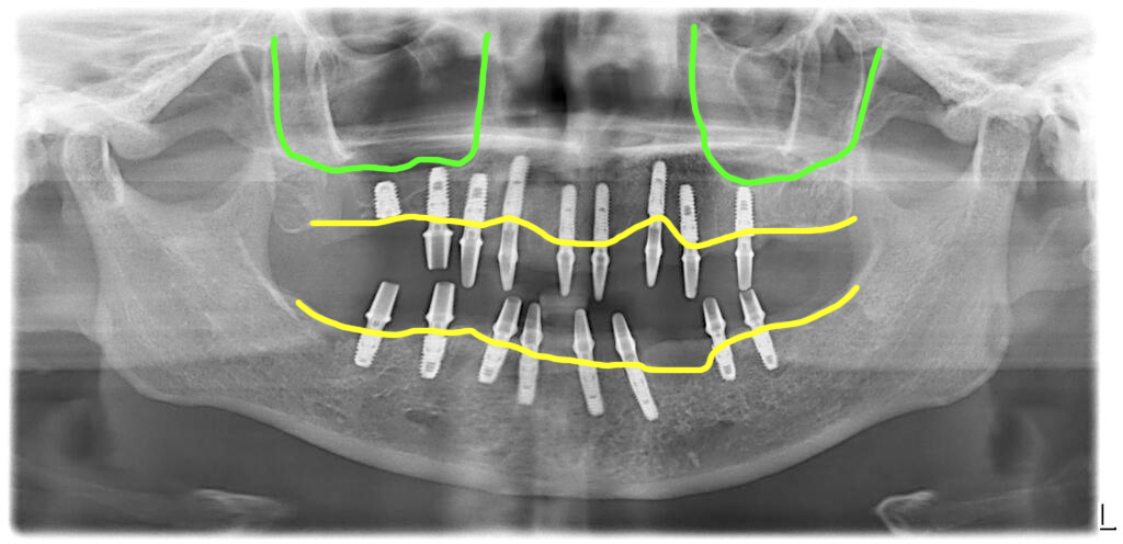 남아있는 치아들을 모두 발치하고 임플란트를 식립했습니다. 위쪽 오른쪽 어금니 부분에는 뼈가 너무 없어서 상악동 뼈이식을 측방접근법(윈도우)으로 시행하면서 임플란트를 식립했어요.