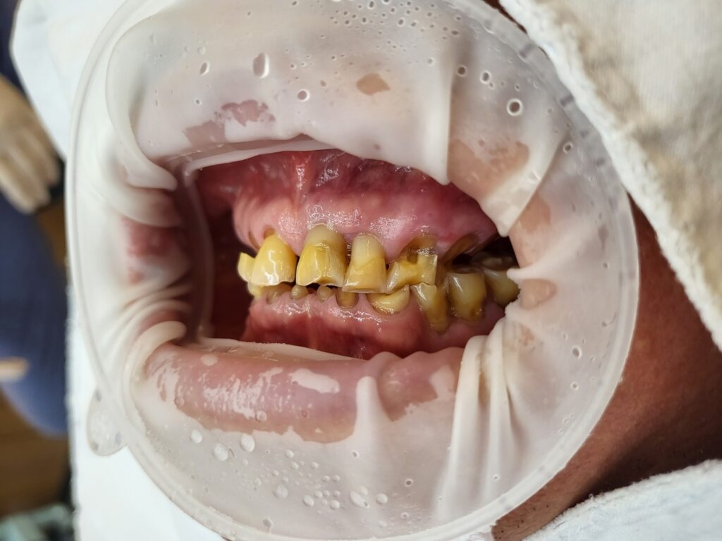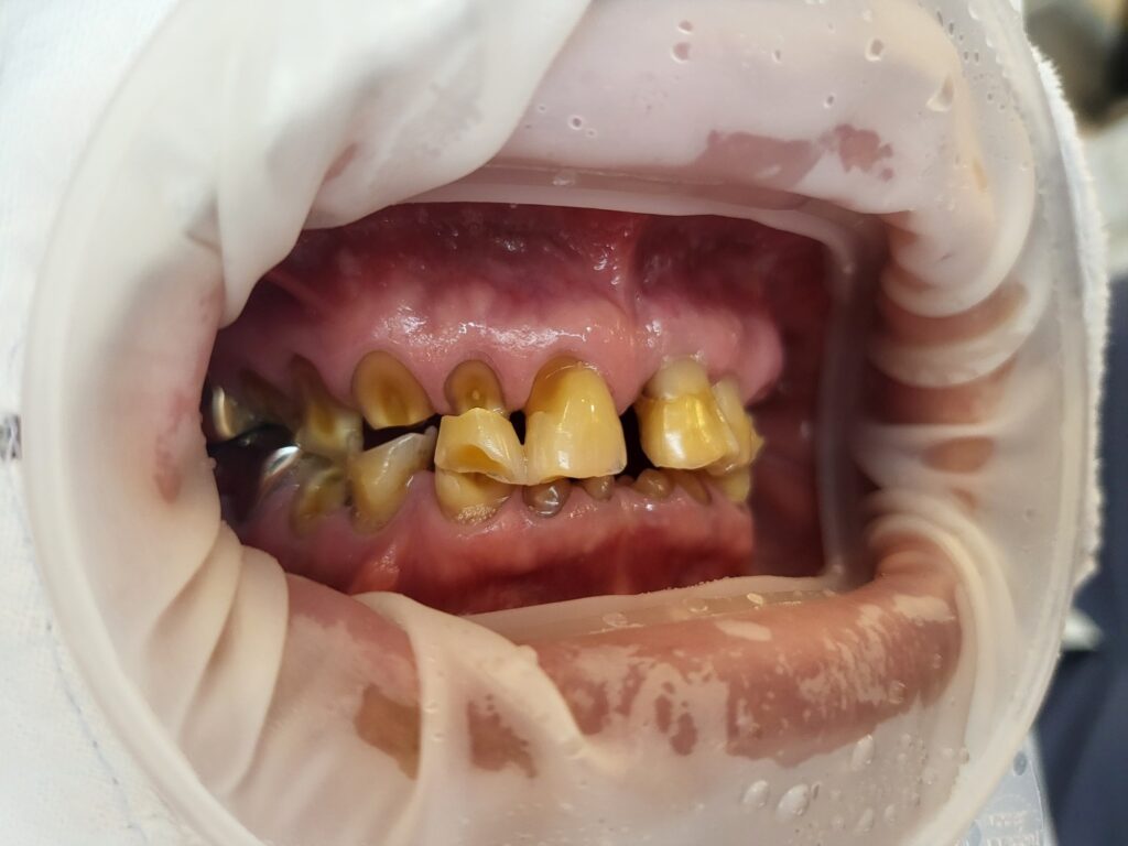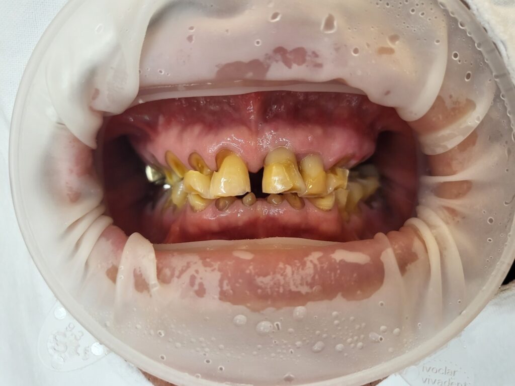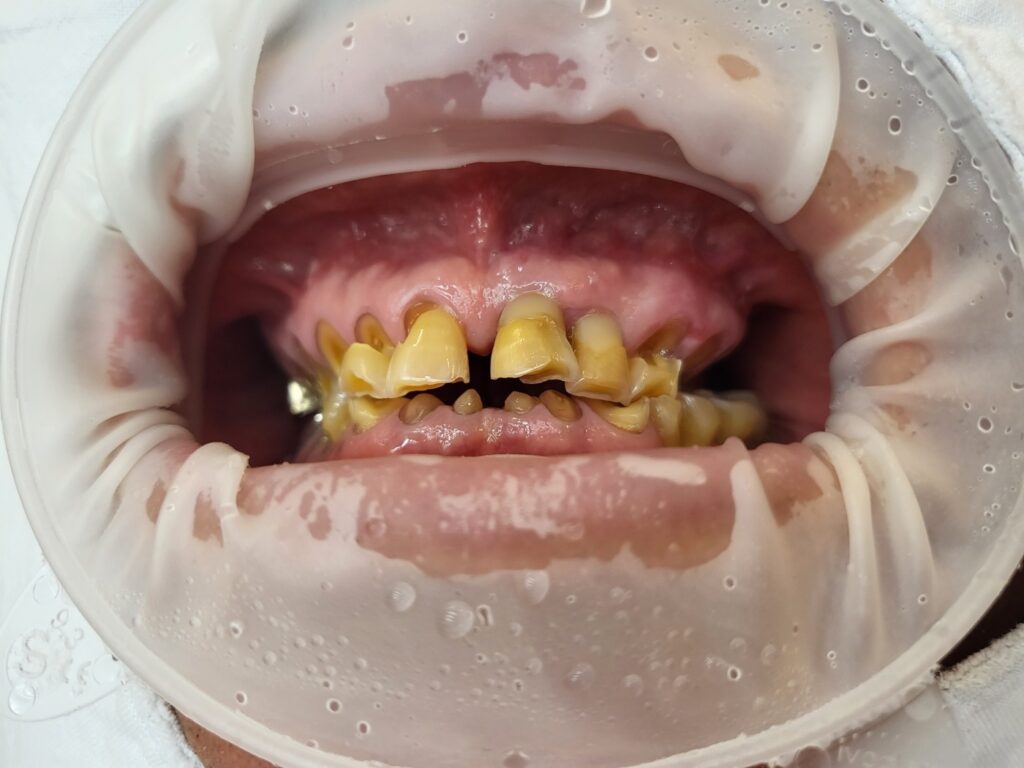 오늘 설명해 드릴 사례는 치아마모가 아주 심해 거의 대부분의 치아들이 뿌리만 남은 경우입니다. 치아마모는 치아교모라는 용어를 쓰기도 하는데요. 치아아 닳아서 크기가 줄어든 것을 말합니다.