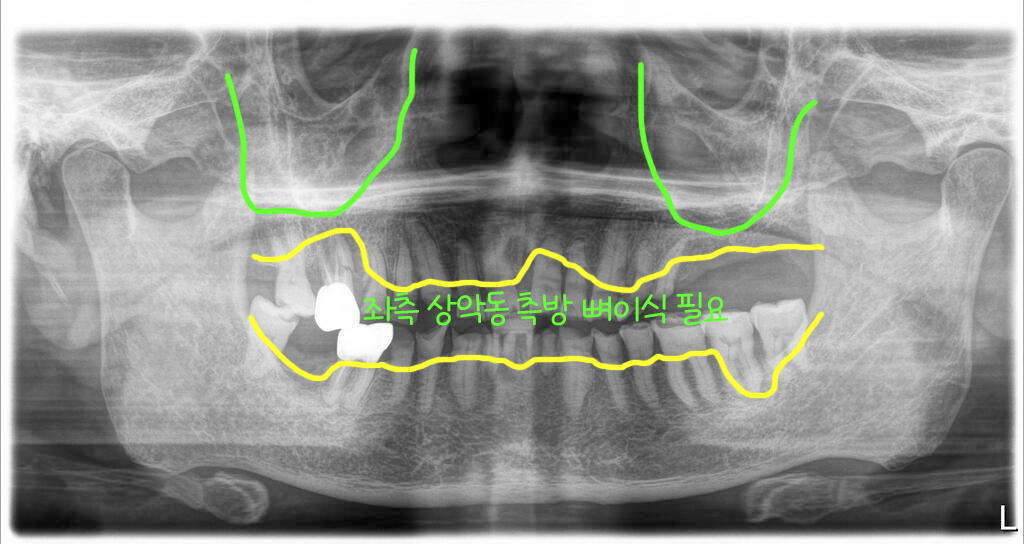 위쪽에 치아뿌리 염증이 심한 어금니 한개가 아래로 내려와 있었고, 위쪽 왼쪽(사진상으론 오른쪽) 어금니 부위에는 이미 치아가 빠져있고 뼈가 너무 없어 상악동 측방 뼈이식이 필요한 상태였어요.