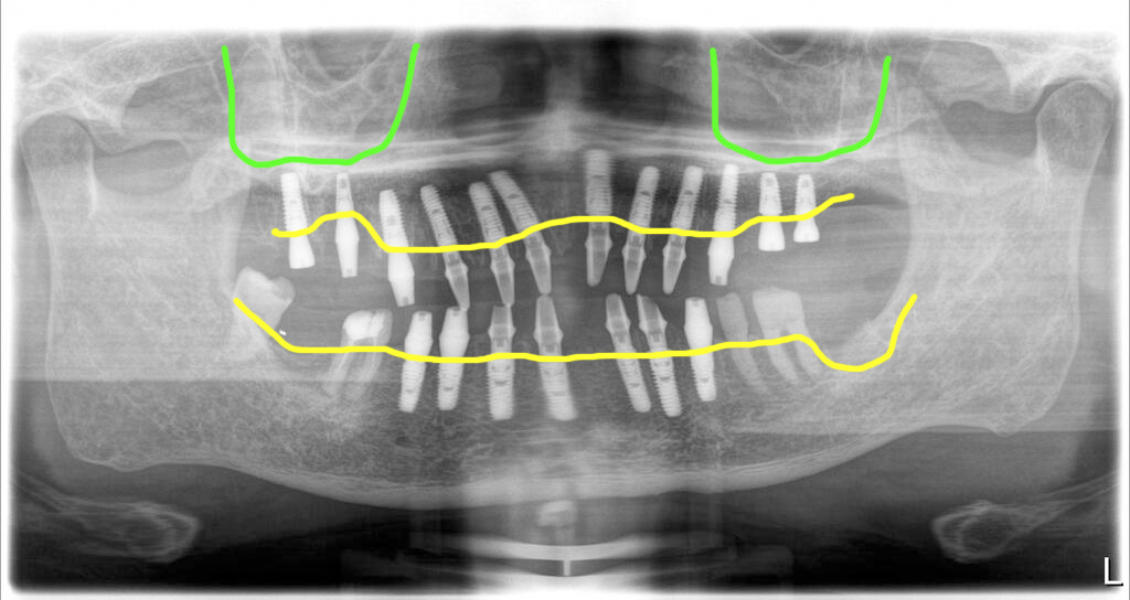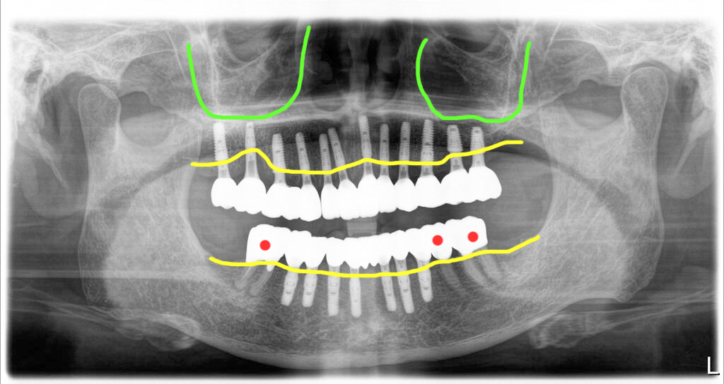 아래쪽에 빨강색으로 표시된 부분은 자신의 치아를 살려서 다시 크라운으로 치료한 모습입니다. 그리고 마모로 인해 소실된 고경(위턱과 아래턱과의 높이)도 함께 회복했습니다. 전체 맞춤지대주에 지르코니아로 마무리된 파노라마 엑스레이 사진입니다.