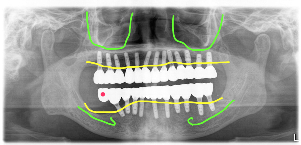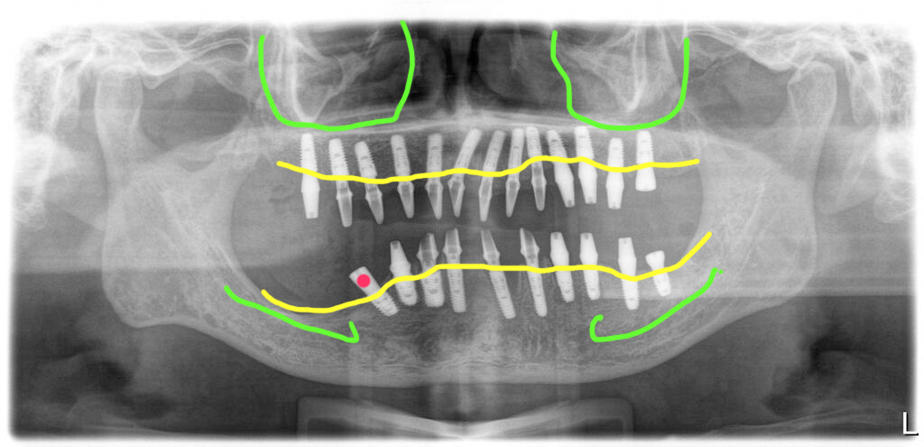 수술직후의 파노라마 사진입니다. 상악에는 13개의 임플란트를, 하악에는 10개의 임플란트를 식립했지만 신경과 너무 가까운 부위는 피해서 심었습니다.