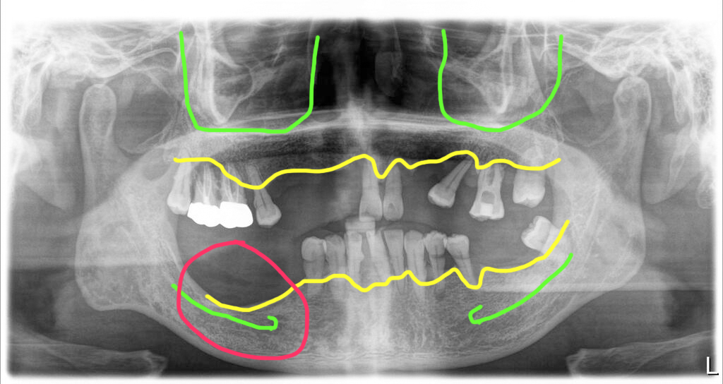 오늘 설명해 드릴 사례는 하악에 치조골이 너무 심하게 파괴되어 하악신경의 가지인 하치조신경과의 거리가 너무 가까워 해당 부위에 임플란트를 심지 않고 피해서 치료를 마무리한 경우입니다.