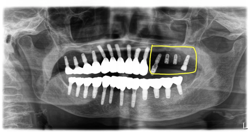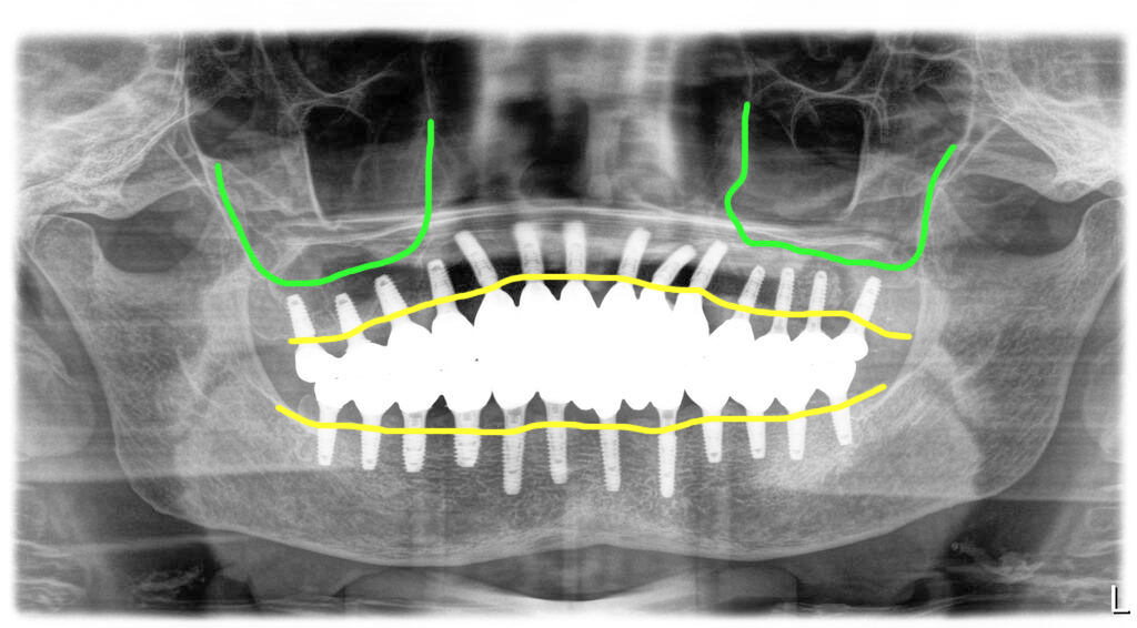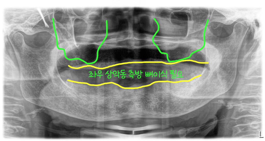 틀니를 하시려고 치아를 모두 뽑았고 잇몸은 모두 다 나은 상태로 내원하셨어요. 파노라마 엑스레이상으로 하악골은 양호한 편이었으나, 상악 구치부에는 상악동이 아래로 쳐져 있어 뼈가 부족한 상태였습니다.