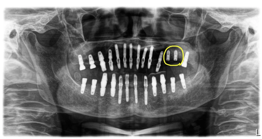 상악에 12개, 하악에 12개의 충분한 개수의 임플란트를 식립했습니다. 임시틀니 상태에서 너무 힘들었다고 했고 연령이 많아 골밀도가 떨어지는 점을 감안했어요.
