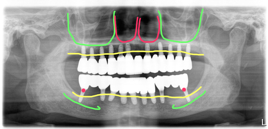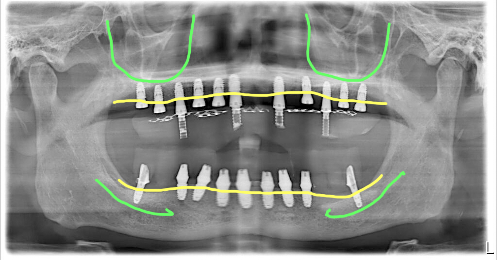 치아가 완전히 없는 상태에서 꽤 오랜 시간이 지나서 치조골 높이가 많이 낮아져 있습니다. 위턱 아래턱 모두 뼈가 있지만 높이가 충분하지는 않았습니다. 무리하게 긴 임플란트 식립을 하지 않고 이용할 수 있는 뼈 내서 길이를 정해 식립하기로 결정했습니다.
