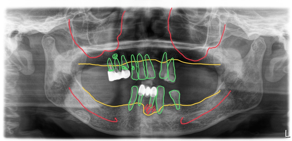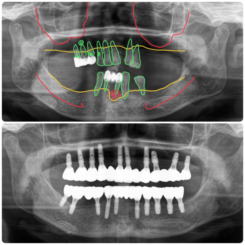 여러 개의 치아들이 이미 상실되어 있었고, 남은 치아들은 치아뿌리의 염증이 있거나 치주염으로 이미 많이 흔들리는 상태였습니다.