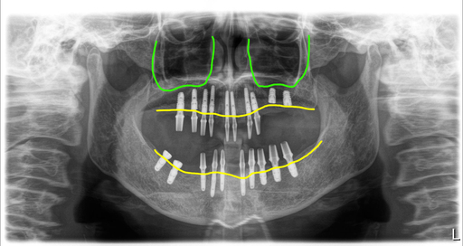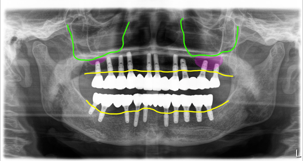 그래서 남은 치아 모두 발치를 하고 전체임플란트치료를 계획했습니다. 그리고좌측 상악 구치부의 경우 뼈가 많이 부족해서 상악동 뼈이식도 병행하기로 했어요.