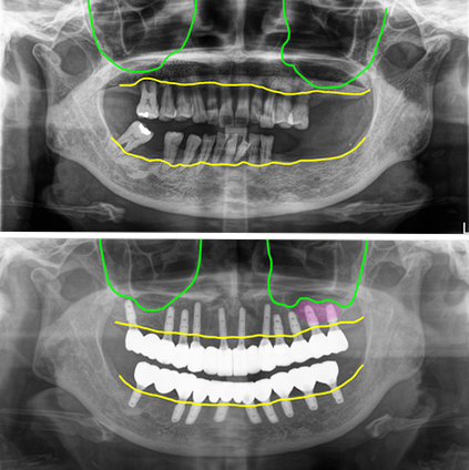 전체 내원 4회 (수술, 실밥, 스캔, 세팅) 치료기간 6개월에 모든 치료를 완료하셨습니다. 위쪽 왼쪽 상악동 윈도우 부분은 초기고정이 약해서 수술시에 잇몸 속에 임플란트를 넣어두었어요.