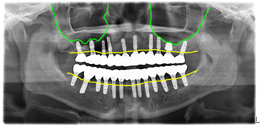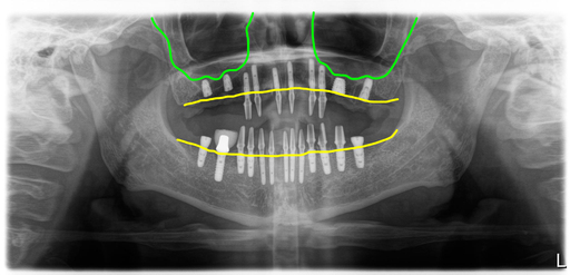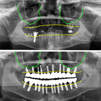 그리고 하악은 이전에 심은 임플란트는 그대로 두고 추가로 12개의 임플란트를 심어서 10개의 임플란트에 지대주 연결해서 임시치아를 적용했습니다.