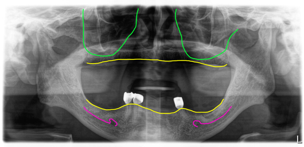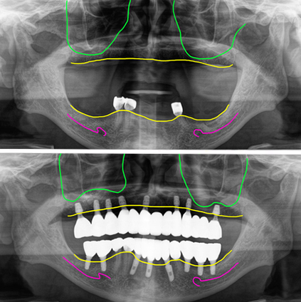 아래에는 부분틀니를 쓰고 계셨는데 남아있는 치아를 잘 관리하셔서 잇몸이 튼튼하고 위치도 좋았습니다. 그래서 아래 지대치로 사용중이었던 3개의 치아는 남기고 전체임플란트를 하기로 했습니다.