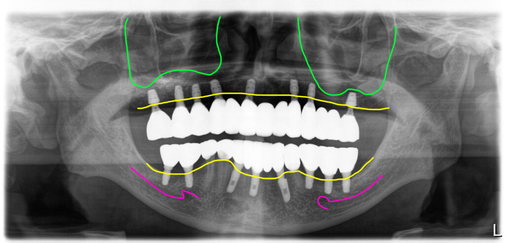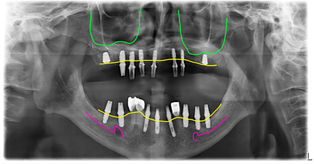 뼈이식과 함께 임플란트를 식립했고, 뼈이식을 한 부위에서 초기고정이 부족한 부위는 잇몸 속에 임플란트를 두었습니다.