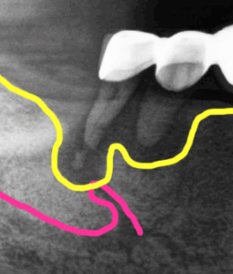 이렇게 빨강색 선인 신경까지 염증(노랑색선)이 진행되어 해당 부위에는 임플란트를 식립할 수가 없는 상태였습니다. 억지로 심게 되면 신경손상 가능성이 아주 높아집니다.