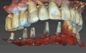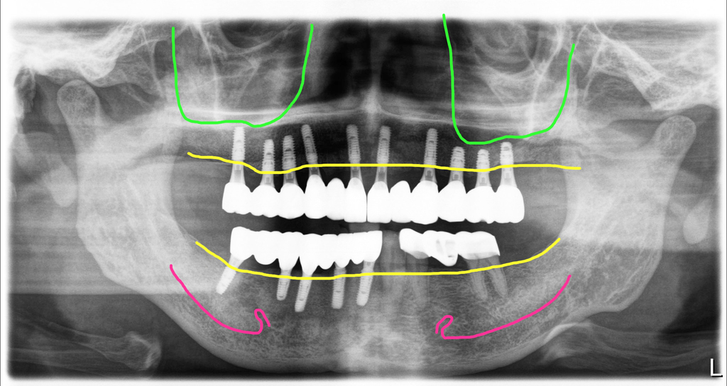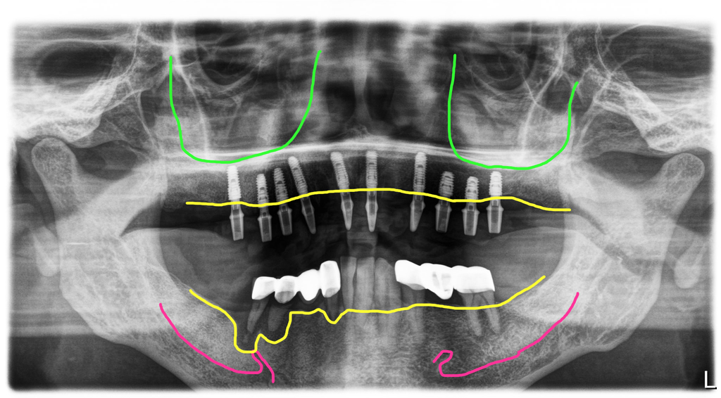 이 분의 경우 환자의 요청에 의해 위아래를 나누어서 한달 간격을 두고 수술을 했습니다. 첫번째 수술 후 4개월째, 두번째 수술기준으로 3개월째 치료를 마무리했습니다. 이렇게 이런 환자의 경우 염증이 심한 부위에는 임플란트를 심지 않고 인공치로 연결하는 방식으로 처리해서 뼈이식을 최소화하고 또 하악신경손상을 방지하는 방식이 좋습니다.