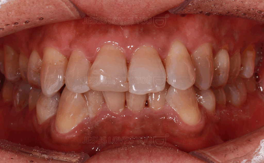 전반적으로 치아가 크고 띠모양의 치아변색을 보이는 전형적인 항생제 치아변색입니다. 11번 치아는 치아파절로 레진이 붙어있었고,위에는 약한불규칙과 튀어나온 22번,그리고 양쪽 송곳니가 뻗으면서 긴 것도 문제였습니다.더불어 아랫니는 심한총생으로 인한 불규칙 상태였죠.