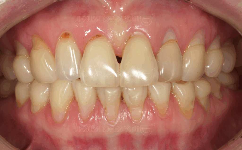 이 환자분은 치아가 전반적으로 닳아 짧아지고 누렇게 변색된 상태였습니다. 더불어 잇몸이 약해져 치아 배열까지 불규칙하게 틀어지면서 미소 지을 때마다 닳고 낡은 치아가 드러나 실제 나이보다 훨씬 더 나이 들어 보인다는 고민을 안고 계셨습니다. 이분은 아름다워지고 싶은 마음은 컸지만, 바쁜 일정 때문에 여러 번 치과에 내원하는 것에 대한 시간적 부담을 느끼고 있었습니다.
